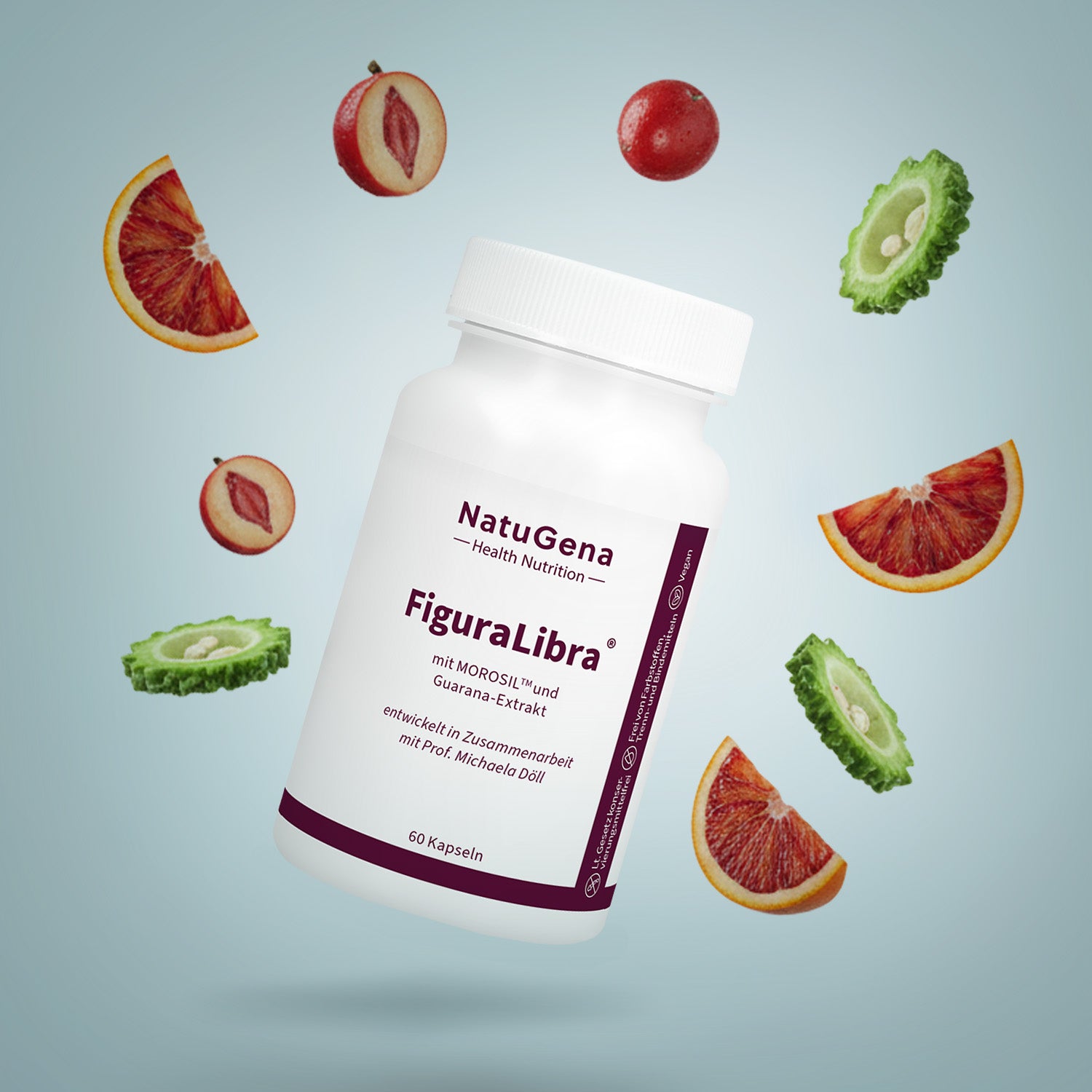 FiguraLibra mit speziell ausgewählten Zutaten spricht Frauen an, die ihre Figur befreien wollen. Es trägt durch Chrom und Zink zu einem normalen Stoffwechsel von Makronährstoffen bei. Die Inhaltsstoffe können zusammen mit freudiger Bewegung und vitaler Ernährung dabei unterstützen, Überschüssiges abzuschütteln und sich wieder freier und wohler im Körper zu fühlen.