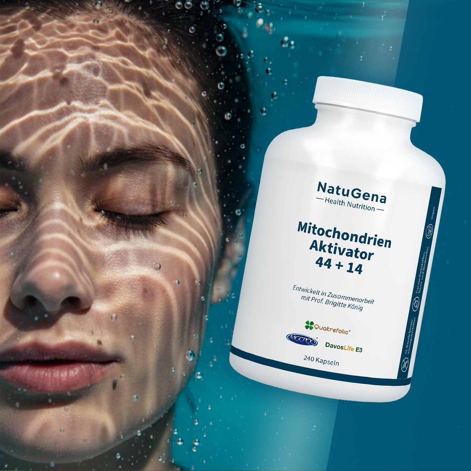 Mitochondrien Aktivator 44 + 14 von NatuGena kombiniert Vitamine, Mineralstoffe, Antioxidantien, Aminosäuren und weitere Nährstoffe.