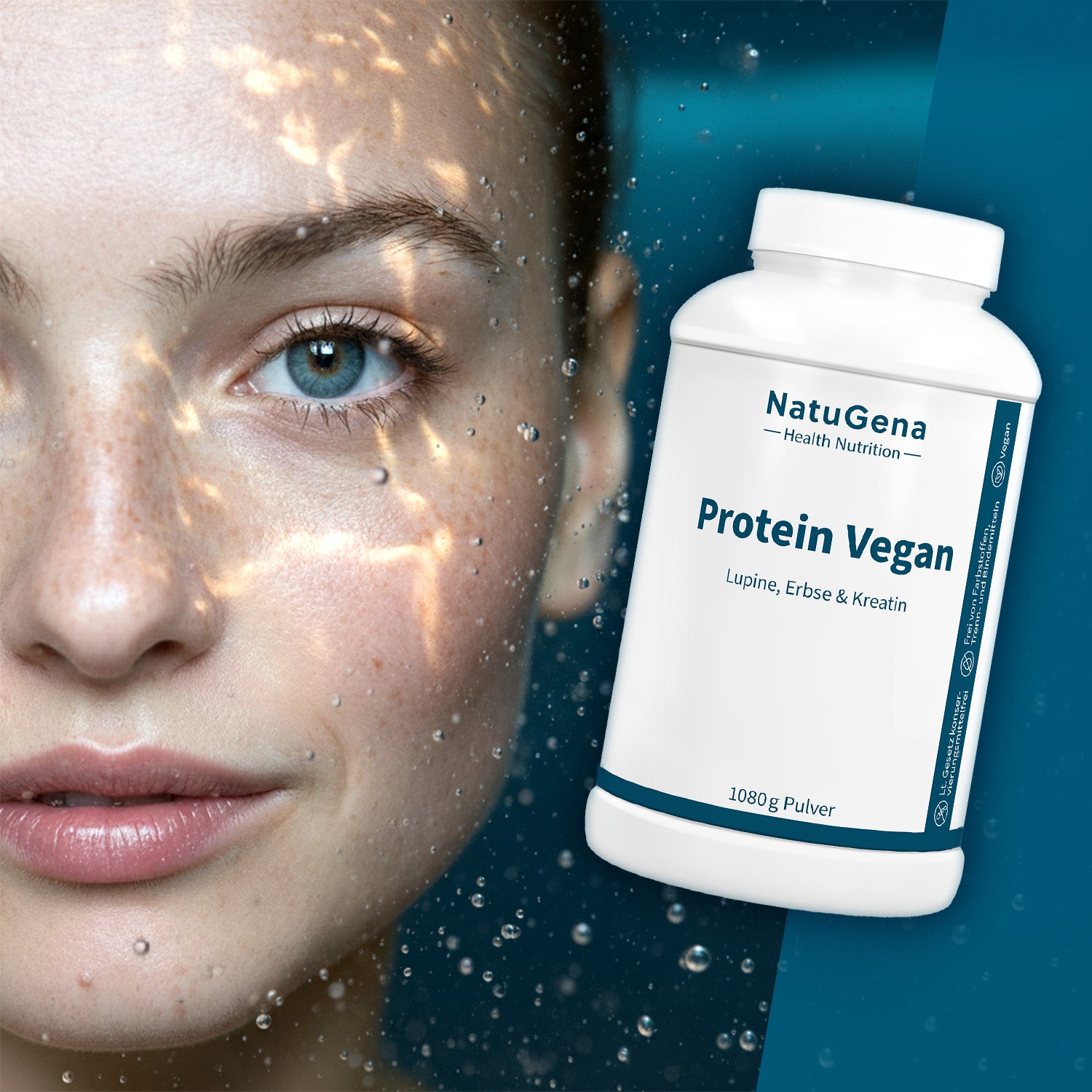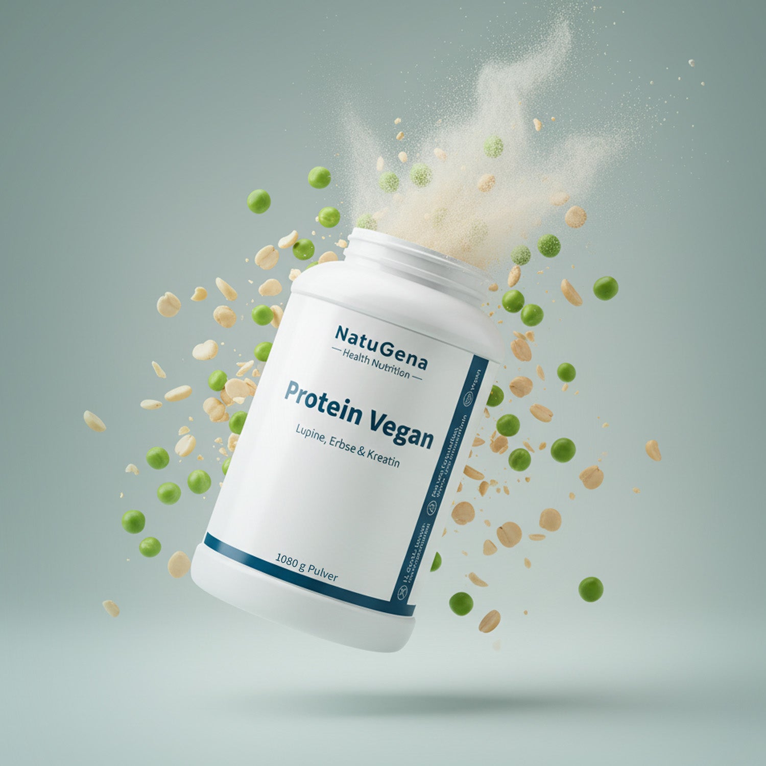 NatuGena Protein Vegan – Kombiniert hochwertiges Erbsen- und Lupinenprotein zu einer ausgewogenen pflanzlichen Eiweißquelle – ergänzt mit L-Glycin, L-Carnitin und Kreatin sowie gezielt ausgewählten Mikronährstoffen. Die Rezeptur liefert ein vollständiges Aminosäurenprofil und bietet eine ernährungsbewusst konzipierte, durchdachte Alternative zu tierischem Eiweiß. 20 g Protein pro Tagesportion. 1.080 g Pulver für eine 24-Tage-Versorgung.
