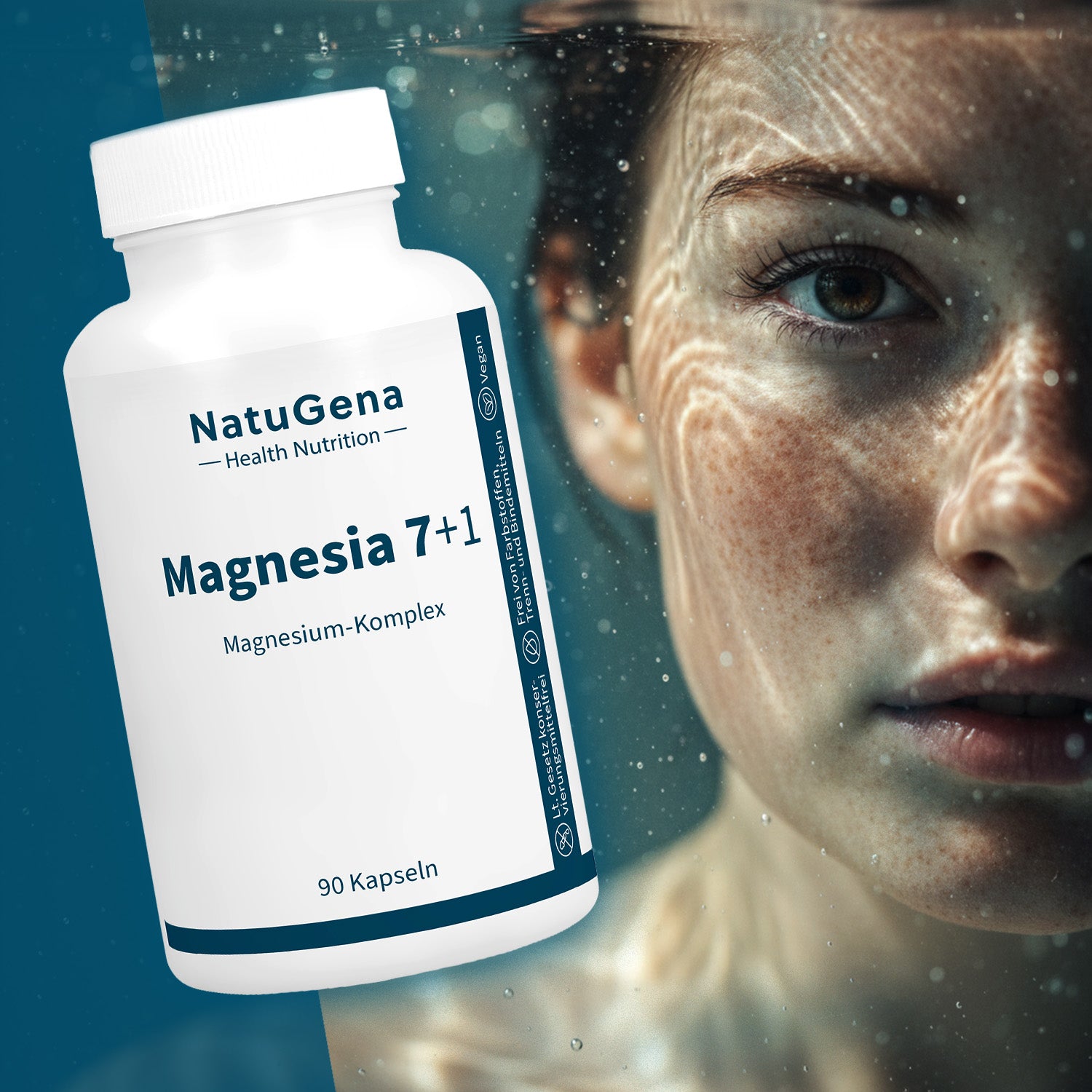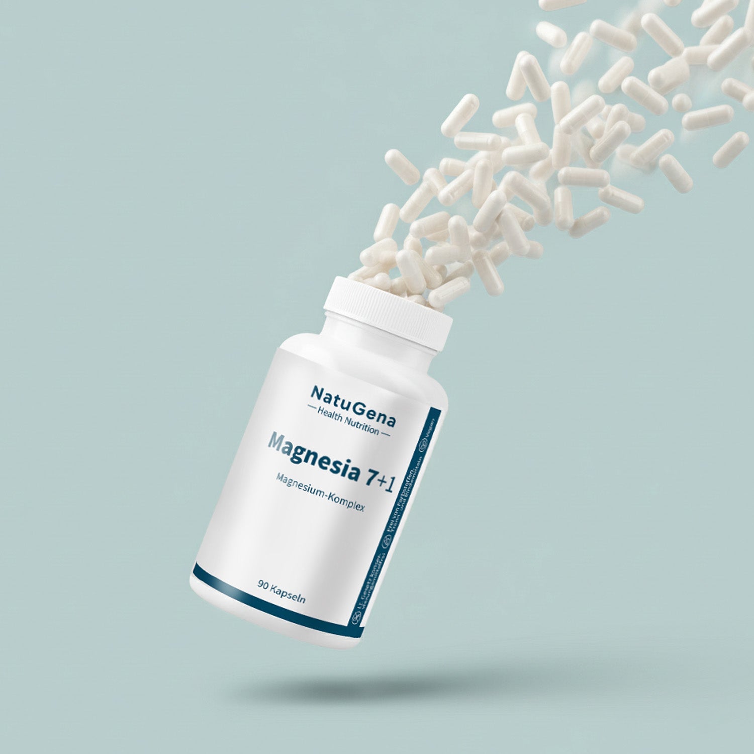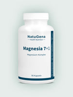NatuGena Magnesia 7+1 – Ein optimal abgestimmter Magnesium-Komplex mit acht verschiedenen Magnesiumverbindungen. Diese ausgewogene Mischung aus organischen und anorganischen Magnesiumverbindungen sorgt für eine umfassende Magnesiumversorgung. Frei von Zusatzstoffen, vegan und in deutscher Herstellung – speziell verpackt in magensaftresistenten Kapseln.  90 Kapseln für eine 30-Tage-Versorgung.